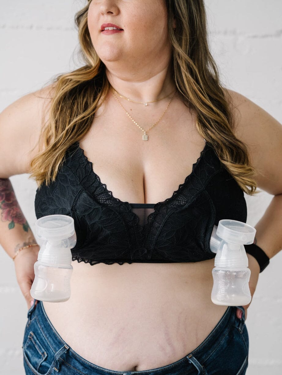 The Riley Bralette Is All You Need for Pregnancy Through Postpartum. It’s 1 Lace Nursing Bralette Designed For Pumping and Combo Feeding Moms – This Sexy Maternity Bra Supports Pumping Flanges, Wearable Breast Pumps, and Collection Cups